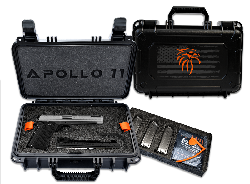The Live Free Armory Apollo 11 is a 9mm Luger striker-fired semi-auto pistol featuring a 4.15" stainless match-grade barrel and optic-ready slide with serrations. Built with a heat-treated 416 stainless steel slide and 4140 steel frame, it holds 17+1 rounds and includes a beavertail grip safety, textured grip, and Picatinny rail for accessories.