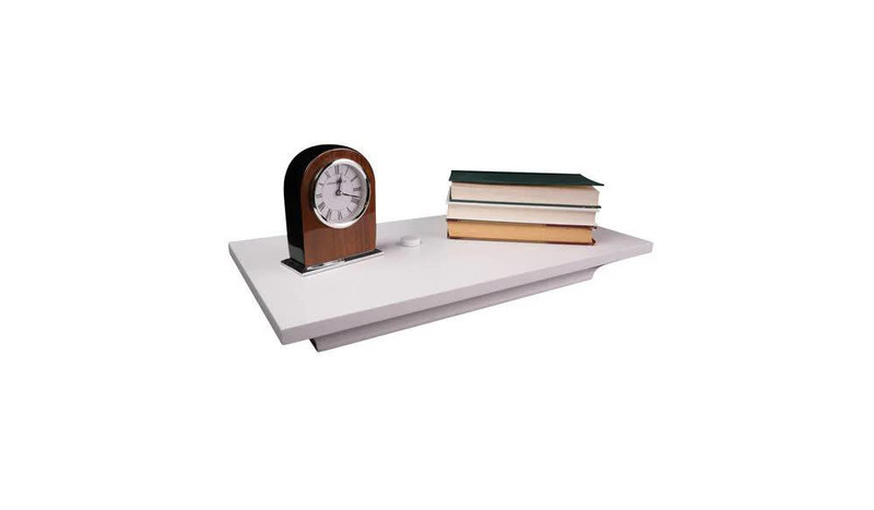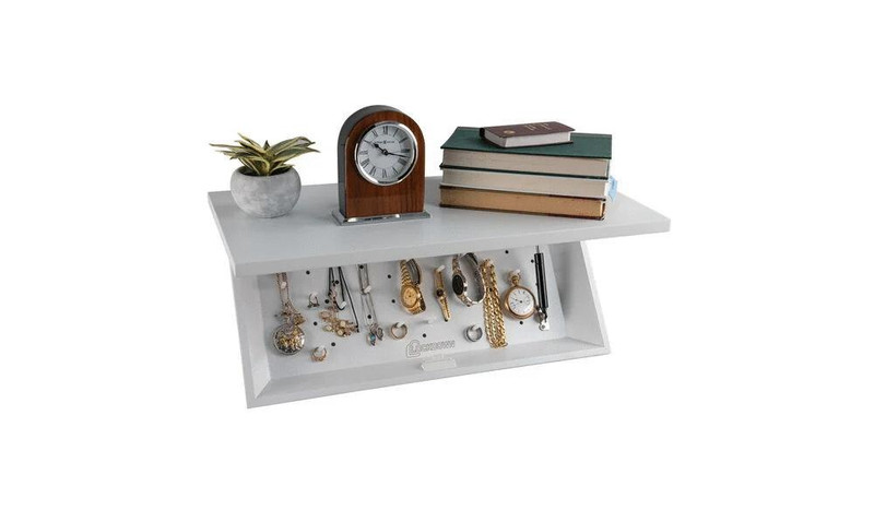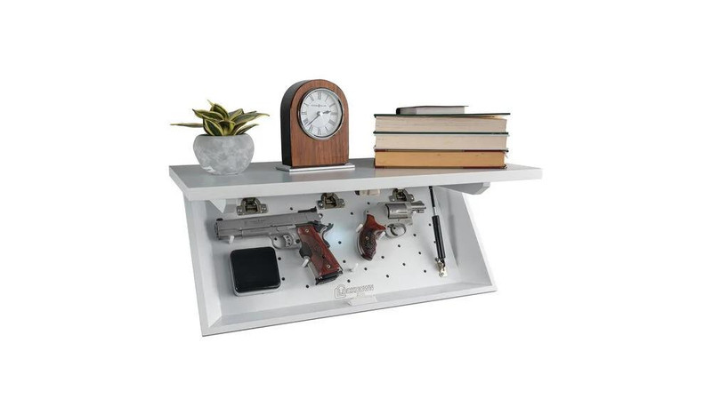 A 24" x 11.75" x 3.25" wooden shelf with a concealed magnetic latch that opens a hidden compartment for secure storage. Features built-in LED lighting for low-light access and is compatible with Lockdown smart safe products. California Prop 65 compliant.