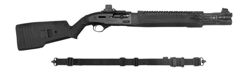 Semi-auto shotgun chambered in 12 gauge with an 18.5" barrel and 7+1 capacity. Features an aluminum receiver, synthetic Magpul stock, ghost ring sights, and includes a Holosun 509T red dot with mount, Streamlight ProTac HL-X light, and Vang Comp side saddle. Weighs 6.4 lbs and comes with a hard case.