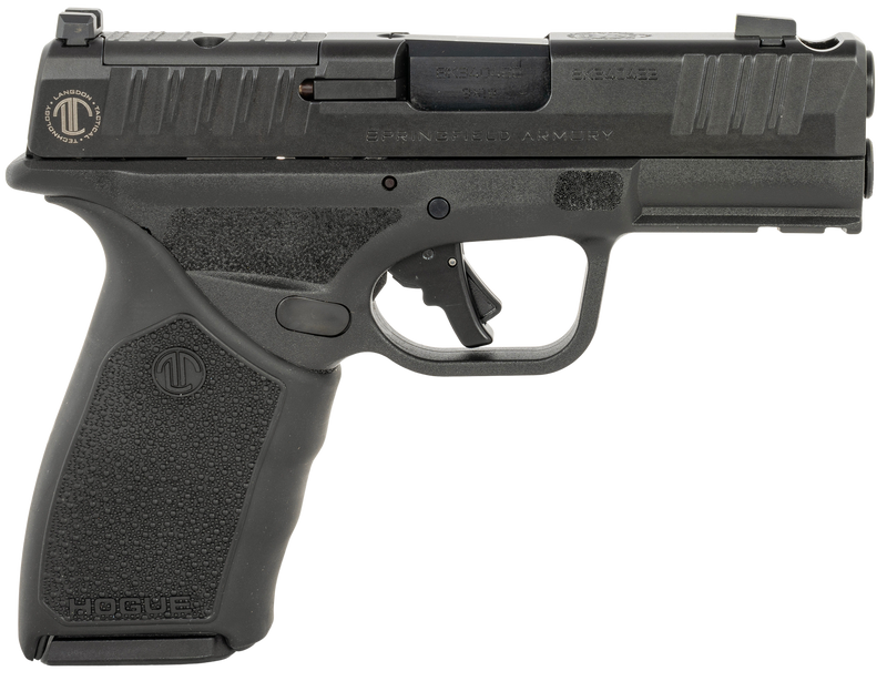 Springfield Hellcat Pro OSP chambered in 9mm Luger with a 3.7" barrel and 15+1 capacity. Features a striker-fired DAO action, optic-ready slide with serrations, and black Hogue grip sleeve. Dimensions: 10" length, 9" width, 2" height.