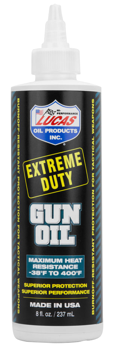 Lucas Oil Extreme Duty Gun Oil is formulated to protect firearms against heat, friction, and wear. This 8 oz squeeze bottle delivers reliable lubrication for general firearm maintenance and care. The product is hazmat-regulated and requires ground shipping only.