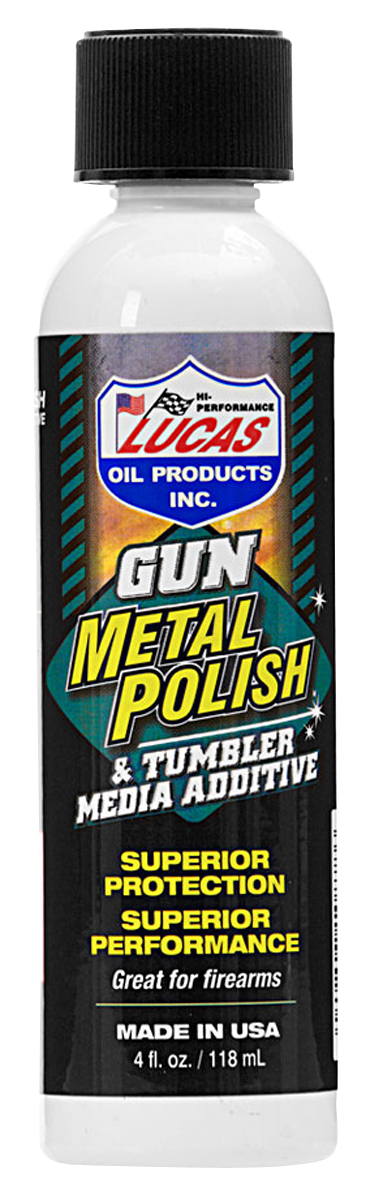 Lucas Oil Gun Metal Polish is a 4 oz liquid designed to protect firearms against rust and corrosion while polishing metal surfaces. This product also functions as a tumbler media additive. It is formulated for general gun care and maintenance.
