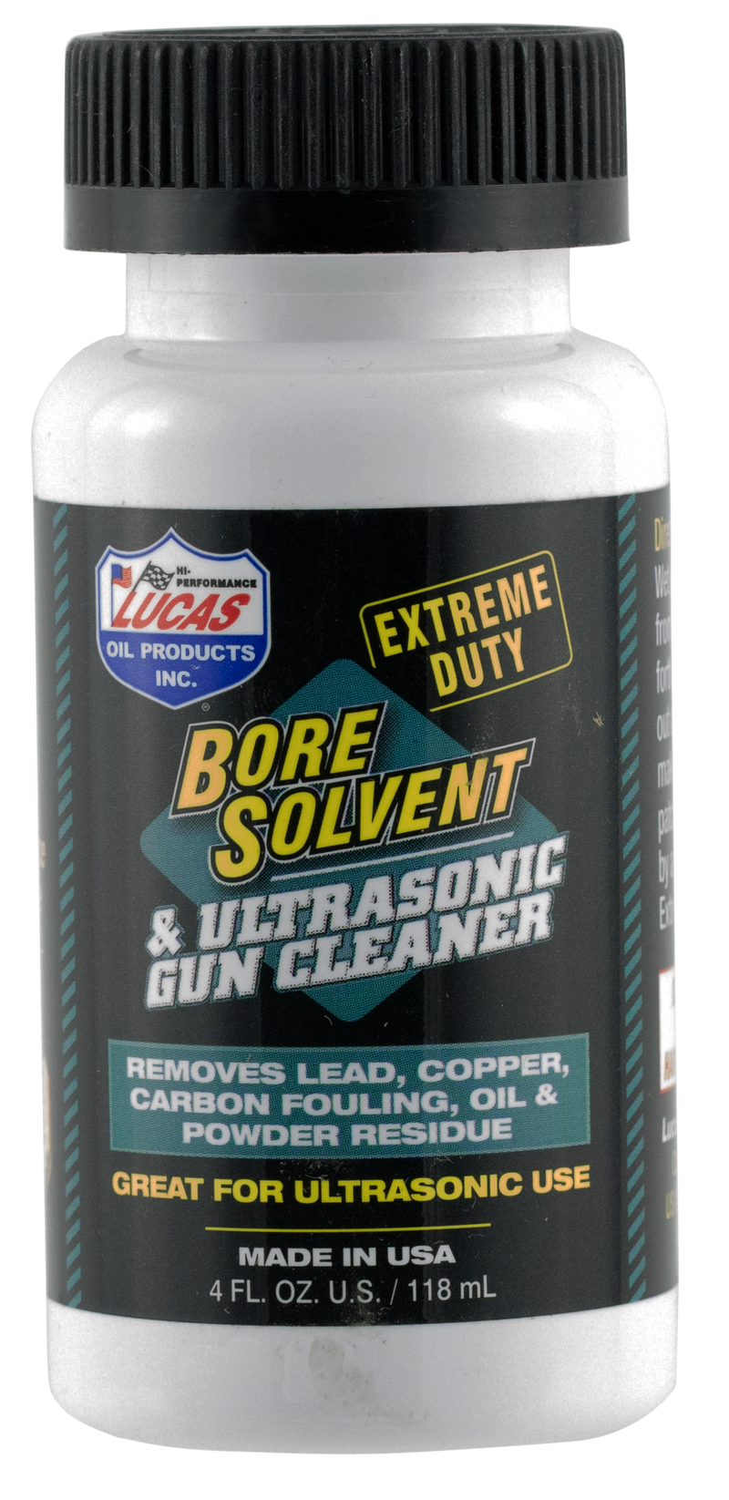 Lucas Oil Extreme Duty Bore Solvent is a liquid cleaner formulated to remove fouling and protect against rust and corrosion in firearm bores. This 4 oz jar is designed for firearms maintenance and cleaning. The product is hazardous and requires ground shipping only.