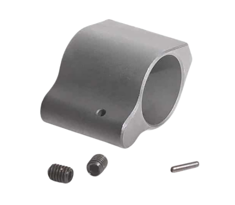 Low profile gas block designed for .223 Remington/5.56mm AR-15 rifles with a .750 inch inner diameter. Features two set screws, two roll pins, and a 10-32 1/4 socket screw cone point in black manganese phosphate finish. Made in USA with double inspection for quality assurance.
