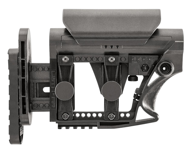 Fully adjustable carbine buttstock assembly designed to mount on AR-15 and AR-10 rifles with either mil-spec or commercial diameter buffer tubes. Features a 3-axis adjustable butt plate with horizontal (length of pull), vertical (shoulder fit), and lateral (cast) adjustment, plus an adjustable cheek piece for enhanced comfort and accuracy.