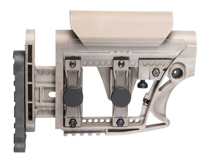 Fully adjustable carbine buttstock assembly designed to mount to AR-15 and AR-10 rifles with either mil-spec or commercial buffer tubes. Features a 3-axis adjustable butt plate with horizontal (length of pull), vertical (shoulder fit), and lateral (cast) adjustment, plus an adjustable cheek rest for enhanced ergonomics and accuracy.