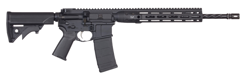Semi-automatic rifle chambered in 5.56 NATO with a 16.1" cold hammer forged spiral fluted barrel featuring a 1:7 twist and 1/2x28 threaded muzzle. Fully ambidextrous controls, free-float M-LOK handguard, adjustable compact stock, and Magpul MOE+ grip. Weighs 6.6 lbs with an overall length of 32" to 35.25" when stock is adjusted.