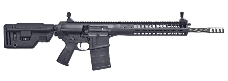 The LWRC REPR MKII is a semi-automatic tactical rifle chambered in 7.62x51mm NATO (.308 Win) with a 16" cold hammer-forged spiral-fluted barrel threaded 5/8x24 and threaded for the included LWRC Ultra muzzle brake. Features include a side-charging handle, B5 Systems collapsible stock, Magpul MOE+ grip, LWRC Skirmish back-up iron sights, and Geissele two-stage trigger. Weighs 9 lbs with an overall length of approximately 37.5" when fully collapsed.