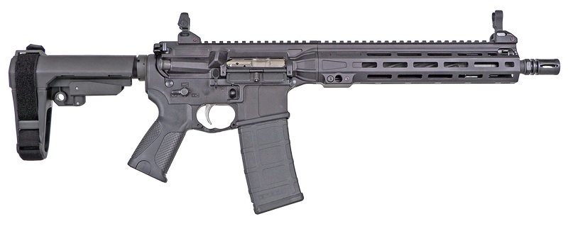 LWRC Individual Carbine MKII in 5.56 NATO/.223 Rem with a 12.7" barrel and gas piston operation. Features flip-up front and rear sights, black polymer grip and furniture, and ships with an SBA3 brace. Overall length is 43" with a width of 11".