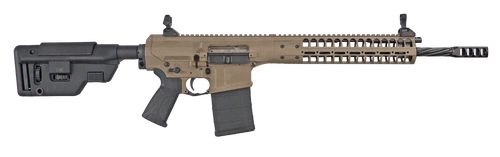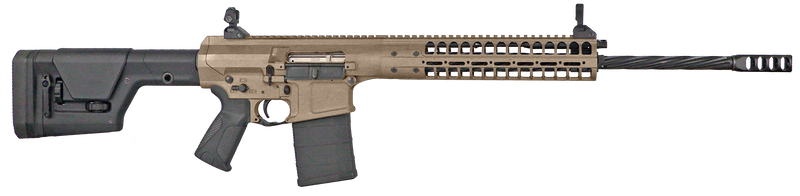 Semi-auto rifle chambered in 7.62x51mm NATO with a 20" spiral-fluted barrel and 1:10 twist rate. Features a Geissele Two-Stage trigger, Magpul PRS stock, LWRC Skirmish back-up sights, side charging handle, and 20-position adjustable gas block. Weighs 9-11.8 lbs with an overall length of 41-43.5" and includes a threaded muzzle (5/8x24) for sound suppressors.