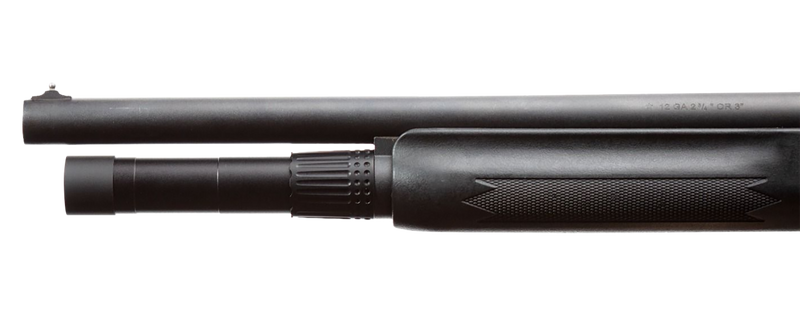 Magazine extension designed for Remington 870 shotguns that increases magazine capacity by 2 rounds. Constructed from black aluminum with a matte finish for durability and corrosion resistance.
