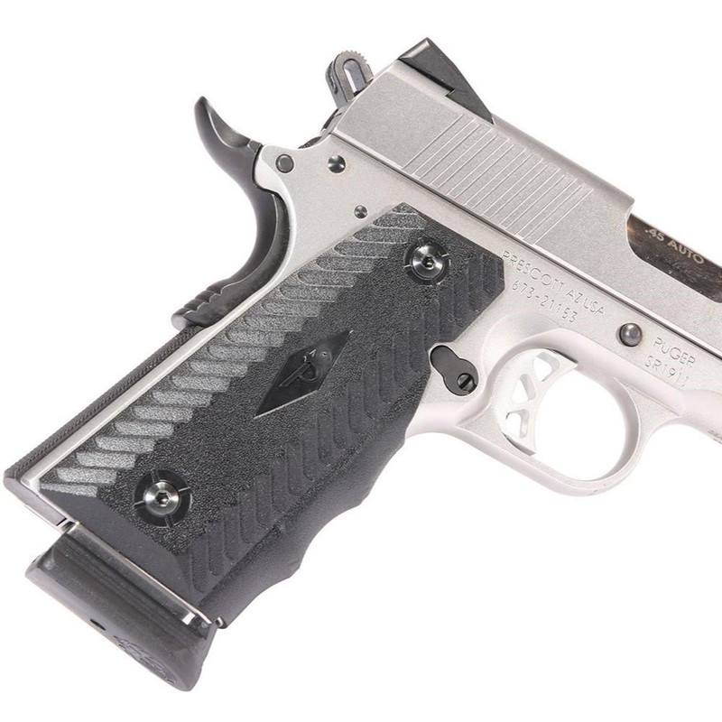 Rubber grip designed for 1911 semi-automatic pistols, made from Pachmayr's proprietary blended rubber compound for enhanced shooting comfort and control. Features an aggressive yet comfortable texture with low-profile finger grooves that provide optimum recoil control and fast positive hand placement.