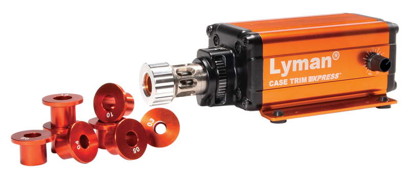 Powered case trimmer designed for rifle reloaders featuring a variable speed motor and carbide cutter for fast, accurate case trimming. Uses bushings that contact the shoulder of bottleneck cases and requires no external power drill. Includes 10 bushings and operates on 115V AC power.