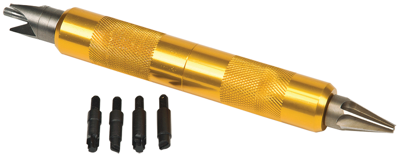 This double-ended storage tool consolidates essential case prep accessories for reloaders in one compact unit. The unique handle unthreads in the middle for internal storage and features threaded ends to mount two interchangeable heads simultaneously. Includes outside deburring tool, inside deburring tool, and large and small primer pocket cleaners and reamers.