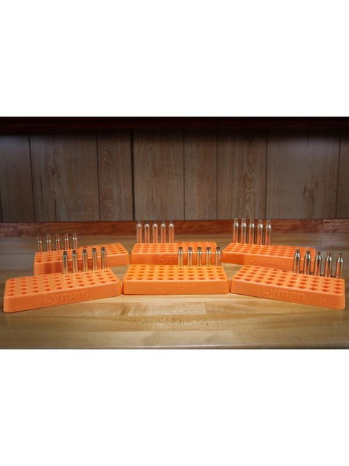 Lyman Custom Fit Loading Block designed for precise cartridge organization during reloading, featuring a .388" hole diameter that accommodates 50 cartridges including .17 Hornet, .17 Rem, and select other calibers. Constructed from durable polymer material with clearly marked hole sizes for easy identification. Blocks nest together for convenient storage and organization.
