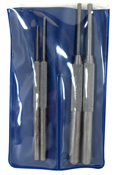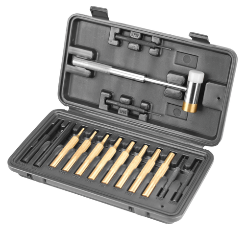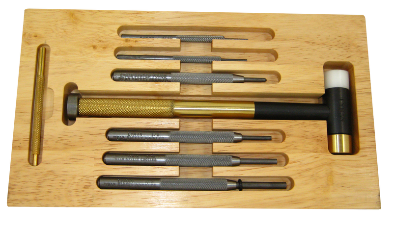 This gunsmithing tool set includes 7 punches (1/16", 3/32", 1/8", 5/32", 3/16", 1/8" center punch) and a brass tapper hammer, all housed in a custom hardwood storage case for organized access. The set features steel punches with brass components, designed for firearm assembly and maintenance tasks. Ideal for gunsmiths and firearms enthusiasts performing detailed work.