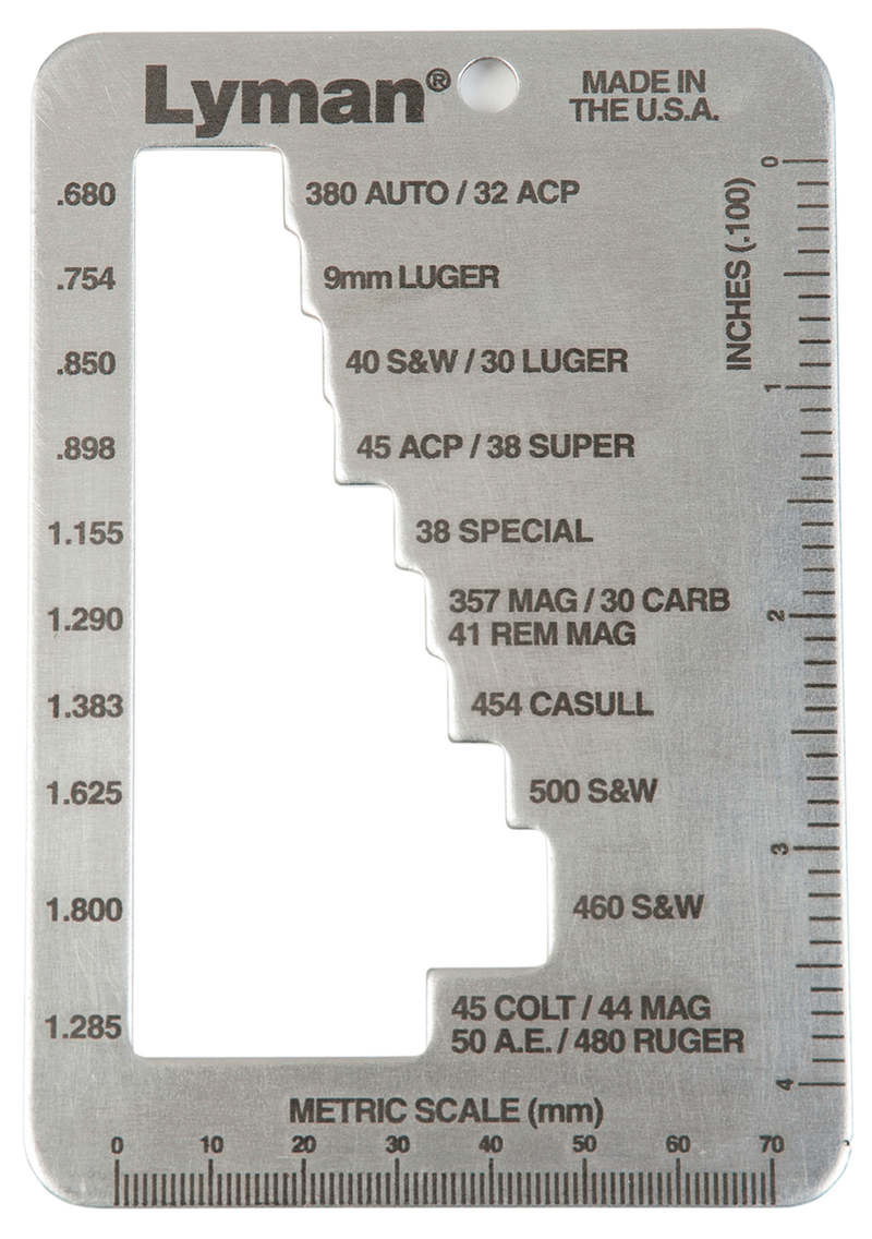 The Lyman E-Zee Case-Length Gauge is a compact metal gauge designed to quickly and accurately measure pistol and revolver case lengths. This convenient tool covers virtually all common pistol and revolver calibers and features a precise "no-go" gauge for fast, easy case length evaluation. Ideal for reloaders who need to sort and verify cases before the reloading process.