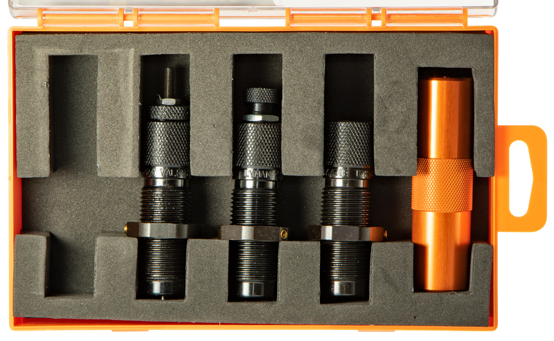 This 4-die set is engineered specifically for MSR (modern sporting rifle) ammunition reloading in 9mm Luger caliber. It features a small base size die for smooth chambering, a separate taper crimp die for tight bullet grip, and includes an Ammo Checker cartridge gauge. The set measures 8.8" x 5.3" x 1.8" and is designed for precision reloading applications.