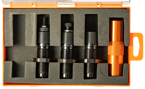This premium carbide 4-die set for 9mm Luger includes a full length sizing die, two-step neck expander M-die, bullet seating die, and separate taper crimp die. Designed for high-volume pistol reloading, the set is precision-crafted for serious reloaders who need consistent, reliable performance. The separate taper crimp die makes this set ideal for pistol calibers that headspace on the case mouth.