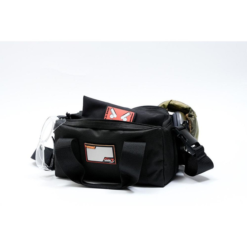 Lyman's two-compartment range bag measures 12" x 6.5" x 6" and is constructed from durable 600 Denier Cordura material with nylon ripstop-lined pockets. Features an adjustable removable shoulder strap, carry handle, and loop panel for custom patches, making it versatile for carrying ammunition, handguns, eye and ear protection, or fired brass.