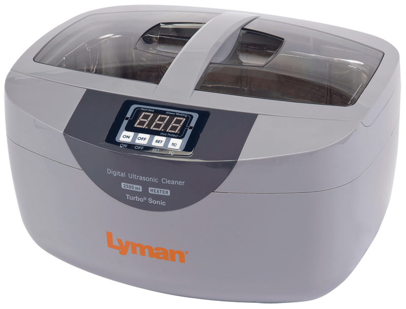 The Lyman Turbo Sonic 2500 is a heated ultrasonic case cleaner that processes up to 900 9mm cases in less than 15 minutes, cleaning cases inside and out including primer pockets. The system uses ultrasonic cavitation and Lyman's specially formulated cleaning solution to remove carbon dirt and residue from fired brass. It features a 2.6 qt plastic basket and tank with 115-volt operation.