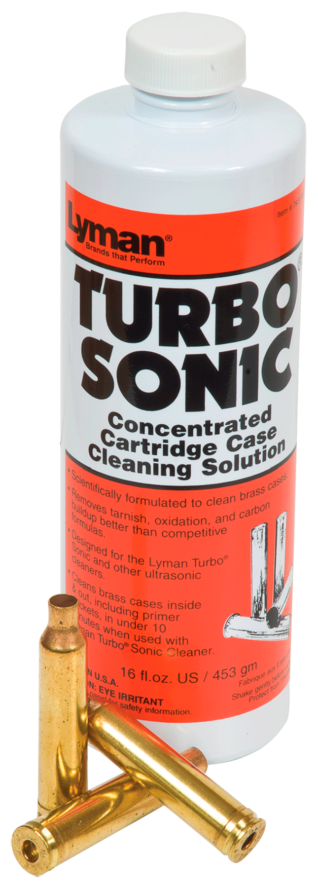 This 16 oz bottle of Lyman Turbo Sonic solution is formulated for use in ultrasonic cleaners to remove fouling from firearm cases, barrels, cylinders, and other steel or stainless steel parts. The solution delivers premium cleaning results for both the inside and outside of cases during the reloading preparation process. Product contains chemical components subject to California Proposition 65.