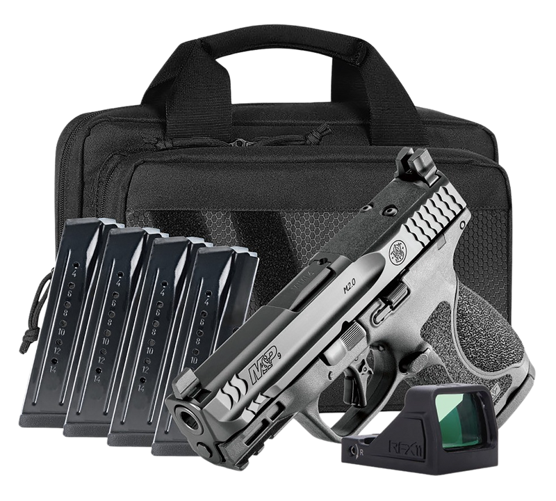 The Smith & Wesson M&P9 M2.0 Compact is a 9mm striker-fired semi-auto pistol with a 3.6" barrel and 15+1 round capacity. This optic-ready model features a polymer frame, fixed steel white dot sights, interchangeable palmswell grip inserts, and comes with a flat-face trigger and Savior Specialist carrying case. The pistol weighs 25.9 oz. and measures 6.8" overall length with a Black Armornite finish.