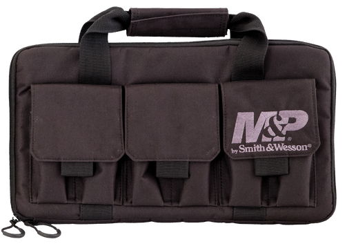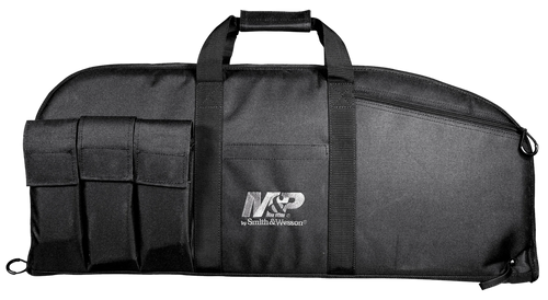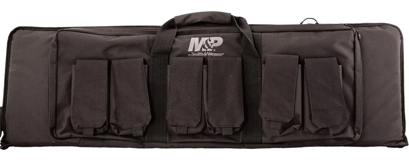 The M&P Pro Tac Gun Case is a 42-inch tactical storage solution constructed from durable ballistic nylon with foam padding on front, back, and bottom for semi-rigid protection. Features include a full-length double zipper opening, 2 rows of MOLLE strapping with 4 interchangeable hook-and-loop straps to secure firearms, a full-length adjustable shoulder strap with removable padded section, and a 31" x 13" x 1.5" external zippered flap pouch plus 6 magazine pouches.