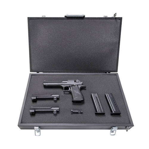 Gas-operated rotating bolt semi-automatic pistol chambered in .357 Magnum, .44 Magnum, and .50 AE with a 6-inch barrel and interchangeable barrel system. Features a steel frame and slide with full Weaver-style accessory rail, single-action trigger with approximately 4 lb. pull, and fixed combat-type sights with 8.5-inch sight radius. Includes three barrels, three magazines (9rd .357, 8rd .44, 7rd .50 AE), and bolt assembly; weighs 3 lbs 11 oz to 3 lbs 13 oz with overall length of 10.75 inches.