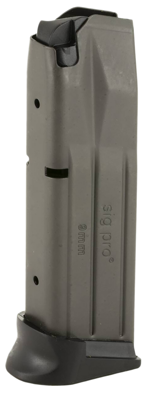 Sig Sauer replacement magazine for the SP2022, SP2340, and SP2009 pistols in 9mm Luger caliber with 10-round capacity. Constructed of steel with a black oxide finish, this detachable magazine is a genuine OEM accessory for reliable feed and retention.