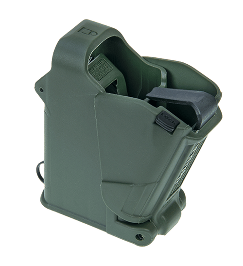 The UpLULA is a military-grade universal pistol magazine loader and unloader designed for 9mm Luger through .45 ACP single and double stack magazines, including 1911s from all manufacturers. It also loads most .380 ACP double-stack magazines. The black polymer loader self-adjusts to fit different magazine widths and loads reliably without hand strain.