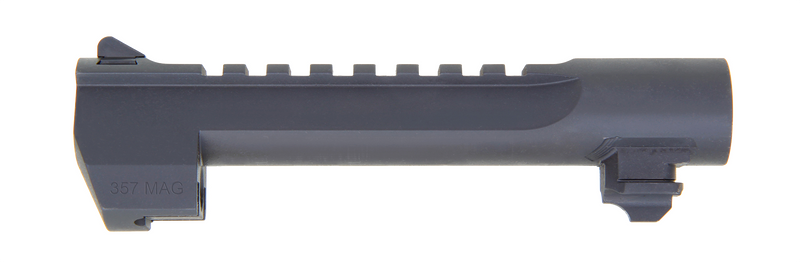 This is a replacement barrel for the Desert Eagle Mark XIX chambered in 357 Remington Magnum with a 6-inch length and matte black steel finish. The barrel features a fixed front sight and Picatinny rail for mounting accessories. Installation is a direct replacement component designed specifically for Desert Eagle Mark XIX pistols.