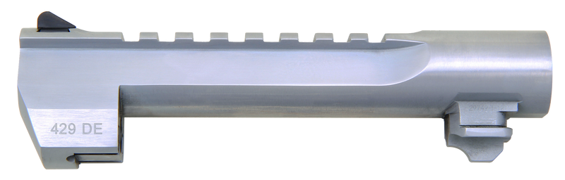 This is a replacement barrel for the Desert Eagle Mark XIX pistol chambered in 429 DE caliber with a 6" length and brushed chrome stainless steel finish. The barrel features a 1:18" twist rate, fixed front sight, and integrated Picatinny rail for optics mounting. Direct replacement component designed for Desert Eagle Mark XIX platform.