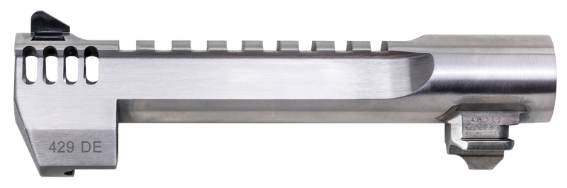 This is a replacement barrel for the Desert Eagle Mark XIX chambered in 429 DE, featuring a 6" stainless steel construction with fixed front sights and integral muzzle brake. The barrel has a 1:18" twist rate and is designed as a direct fit upgrade for Desert Eagle Mark XIX pistols. Installation involves standard barrel removal and replacement procedures typical for Desert Eagle platforms.