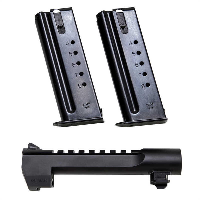 This conversion kit allows users to convert a Mark XIX Desert Eagle .50 AE to .44 Remington Magnum. The kit includes one 6-inch black carbon steel barrel and two 8-round magazines for the new caliber. Simply swap the barrel to change calibers on your existing Desert Eagle platform.