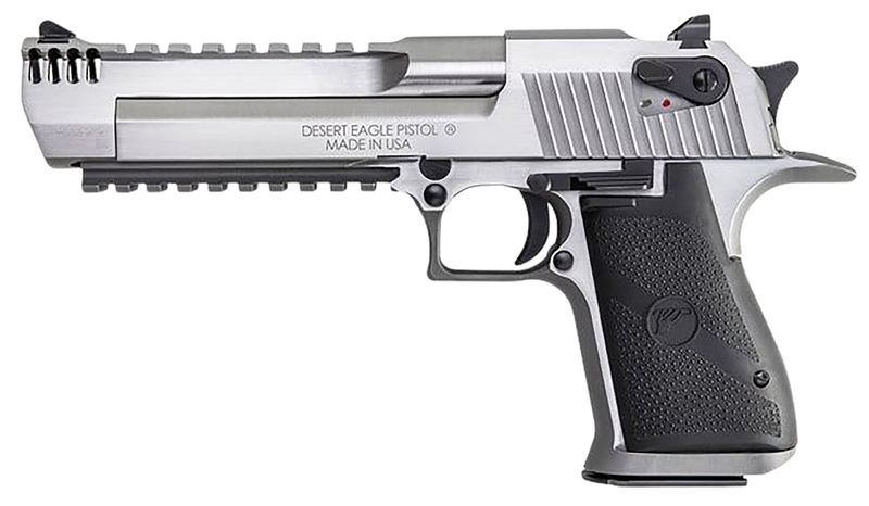 The Desert Eagle Mark XIX is a gas-operated, single-action semi-automatic pistol chambered in .357 Magnum with a 6" stainless steel barrel and 9-round capacity. Features include a stainless steel serrated slide, beavertail frame with Picatinny rail, integral muzzle brake, and fixed combat sights. Overall length is 10.75" with a weight of 70.6 oz.