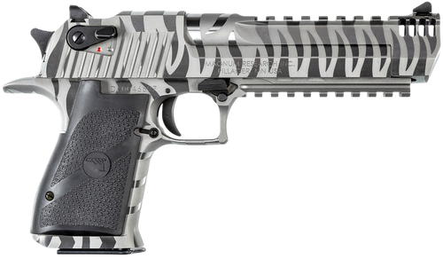The Desert Eagle Mark XIX is a gas-operated semi-automatic pistol chambered in .50 AE with a 6" stainless steel barrel featuring an integral muzzle brake. The all-stainless steel construction includes a serrated slide, ambidextrous safety, Picatinny rail, black rubber grips, and weighs approximately 71 ounces with a 7+1 round capacity.