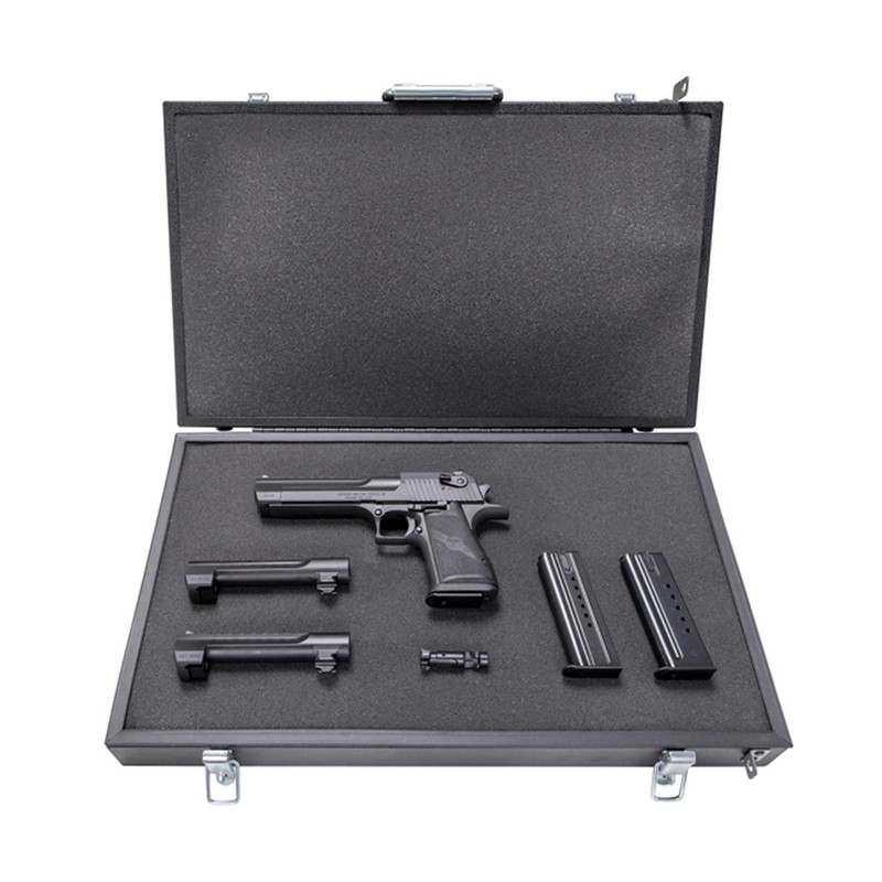 Single-action semi-auto pistol chambered in .357 Magnum, .44 Magnum, and .50 AE with interchangeable 6" barrels and bolt assemblies. Includes three barrels, three magazines (9rd .357, 8rd .44, 7rd .50AE), and protective lockable aluminum case. Steel frame with black oxide finish, adjustable sights, and weighs approximately 71 oz.