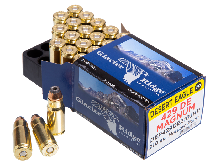 Magnum Research .429 DE (Desert Eagle) 210 grain Jacketed Hollow Point handgun ammunition with a muzzle velocity of 1750 fps and muzzle energy of 1428 ft-lbs. This cartridge delivers a 25% velocity increase and 45% energy increase over standard .44 Magnum. Loaded by HSM in Montana with Sierra bullets and Starline brass, each box contains 20 rounds.