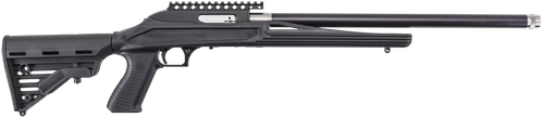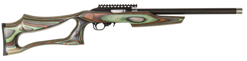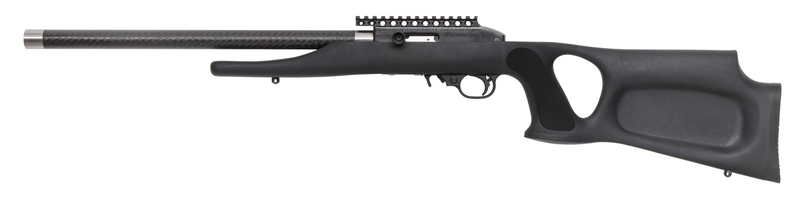 Semi-automatic .22 LR rifle with 17" threaded barrel and 10+1 capacity. Features an ambidextrous thumbhole stock, integrated scope base receiver, and patterned graphite barrel. Weighs 4.25 lbs with 35.5" overall length.