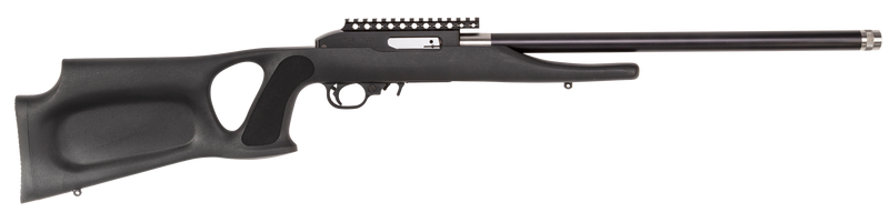 Semi-auto rimfire rifle chambered in .22 LR with an 18" aluminum tensioned barrel featuring a threaded muzzle. The receiver is machined aluminum with an integral Picatinny rail, matte black finish, and pairs with a black synthetic thumbhole stock. Weighs 4.25 lbs with a 10+1 round capacity and is built on the proven Magnum Lite platform with 22 Bentz chamber for accuracy.