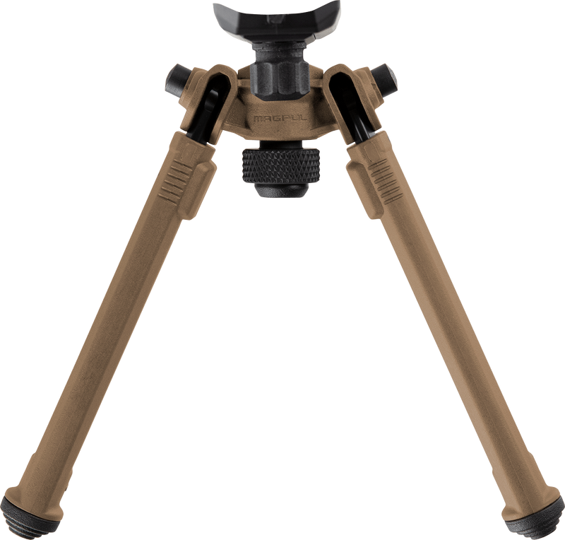 The Magpul MAG1075-FDE is an aluminum bipod with quick detach and sling stud mounting options, featuring 6.3" to 10.3" vertical adjustment and a 50-degree tilt capability. Finished in Flat Dark Earth with rubber feet and designed for AR-platform rifles, this lightweight bipod weighs 13 oz and provides stable shooting support for prone or bench rest positions.
