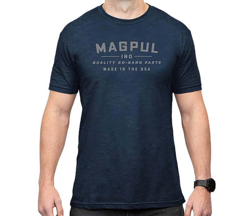 Magpul Go Bang Parts short sleeve shirt made from a cotton/polyester blend in Navy Heather color. Available in size Large with a relaxed fit design suitable for casual wear or range use.