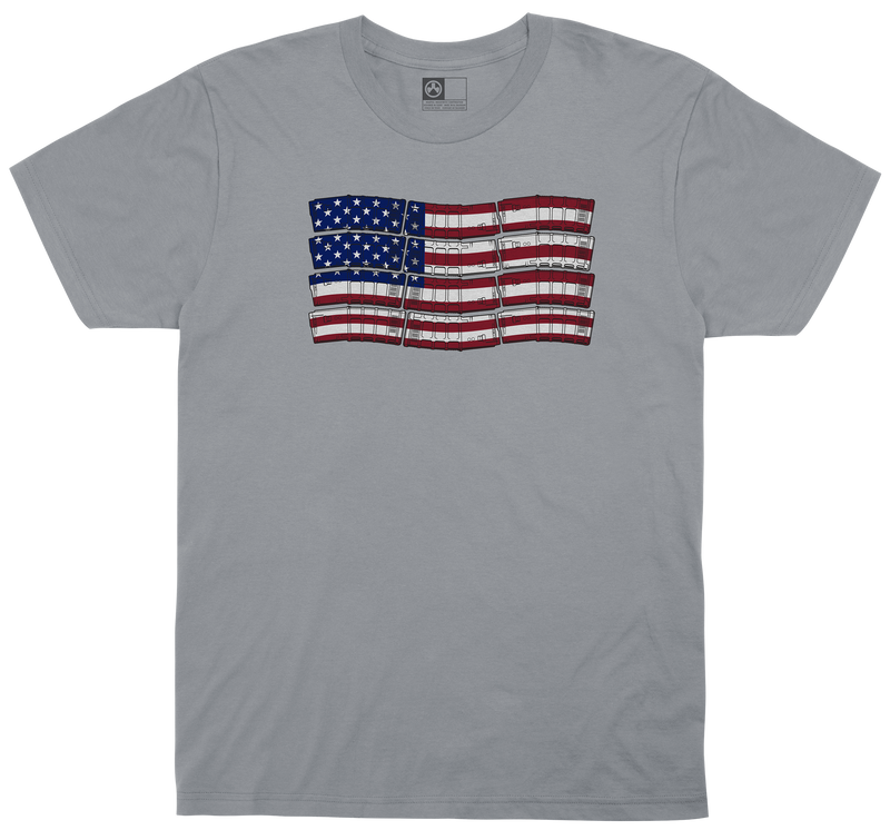 Magpul American Flag cotton/polyester blend short sleeve shirt in charcoal gray. Designed as a casual apparel option for outdoor and tactical enthusiasts. Available in small size.