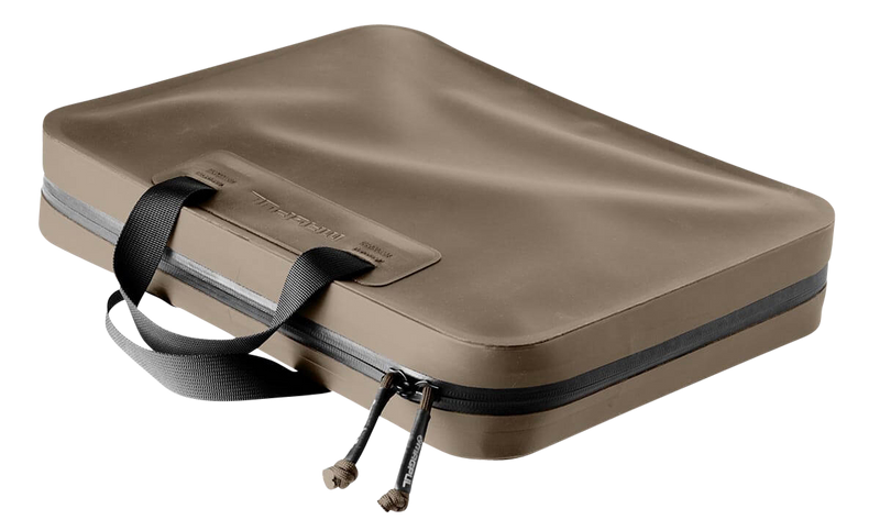 The Magpul DAKA Double Pistol Case measures 14.5" x 11.8" x 2.4" and features reinforced polymer fabric construction with an EVA foam liner. It accommodates two pistols with dedicated sleeves and retention features, secured with a zipper closure.