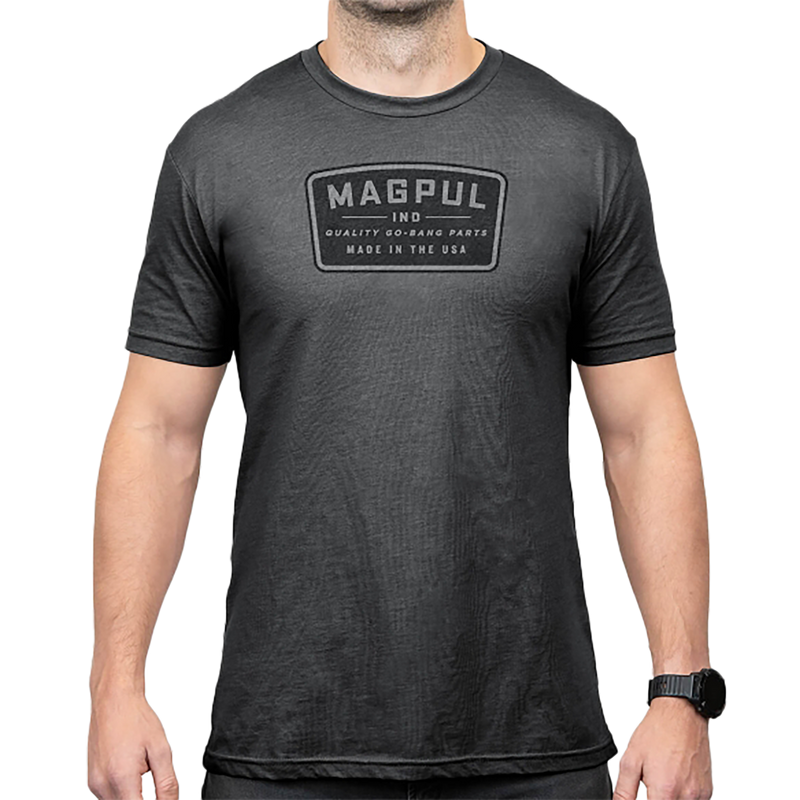 Magpul Go Bang Parts short sleeve t-shirt made from a cotton/polyester blend for comfort and durability. Available in charcoal gray, sized small, this casual apparel piece is suitable for everyday wear or range activities.