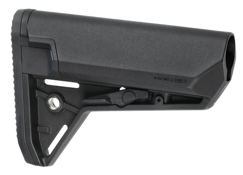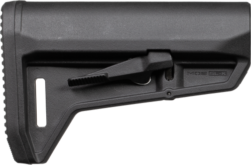 The MOE SL is a drop-in replacement buttstock designed for AR-15/M4 carbines with Mil-Spec receiver extension tubes (tube not included). Made from black polymer, it features dual-side release latches, a rolled toe, and angled rubber butt-pad optimized for use with body armor. The collapsible stock offers 6 positions with a length of pull range from 10.80" to 14.10".