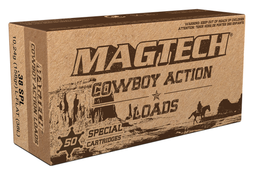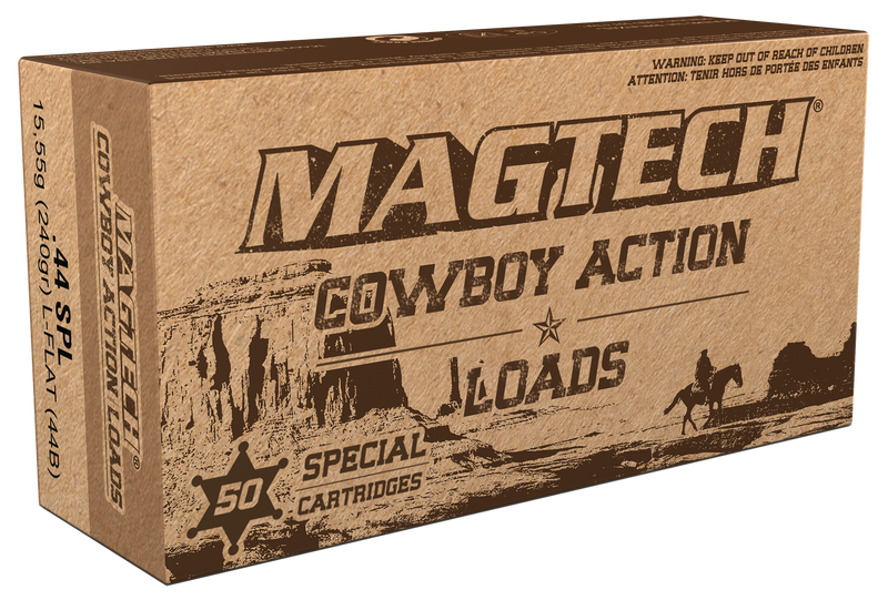 Magtech Cowboy Action ammunition in 44 S&W Special with 240 grain lead flat nose bullets, loaded to 725 fps muzzle velocity and 280 ft lbs muzzle energy. Designed specifically for Cowboy Action Shooting with brass casings and manufactured using full quality control from component selection through final assembly. Sold 50 rounds per box, 20 boxes per case.