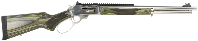 The Marlin 1895 SBL is a lever-action rifle chambered in .45-70 Government with a 19.3" threaded stainless steel barrel and stainless steel receiver fitted with a Picatinny rail. It features a fixed green laminate stock and 6+1 round tubular magazine capacity.