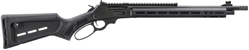 The Marlin 336 Dark Series is a lever-action rifle chambered in .30-30 Win with a 16.17" threaded steel barrel finished in Graphite Black Cerakote and 5+1 round capacity. Features include a Picatinny optic rail, M-LOK handguard, radial muzzle brake, fiber optic front sight with tritium ring, adjustable ghost ring rear sight, and adjustable black polymer stock. Weighs 6.9 lbs with an overall length of 35.5".